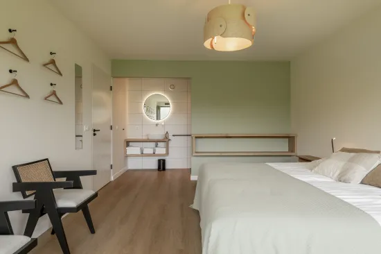 Op de Valkenberg zit je afgelegen met je gezelschap maar niet afgezonderd. WiFi hebben we. Net als een Nivona koffiemachine, zachte handdoeken en opgemaakte bedden. Nu is het aan jou of je wilt bijtanken in vliegtuigstand mét verrekijker of in werkstand mét laptop. En mocht deze laatste nou je voorkeur hebben: tel je dan hoe vaak je ogen over de rand van het scherm schieten opzoek naar de reegeit en haar jongen?